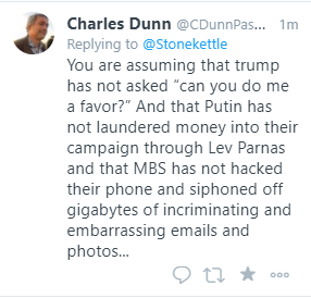 ReplyDeleteI wouldn't be surprised to find some subject to blackmail type pressure. Trump certainly seems wide open to such pressure, his business appears to have been kept afloat by dirty Russian money not far removed from Putin, so the threat of ruination might be there.